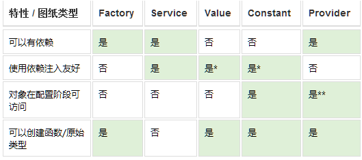 - factory和service是最常用的图纸。它们之间的唯一区别就是service图纸存在一个new过程,所以最好返回一个构造函数,而factory可以创建任意类型