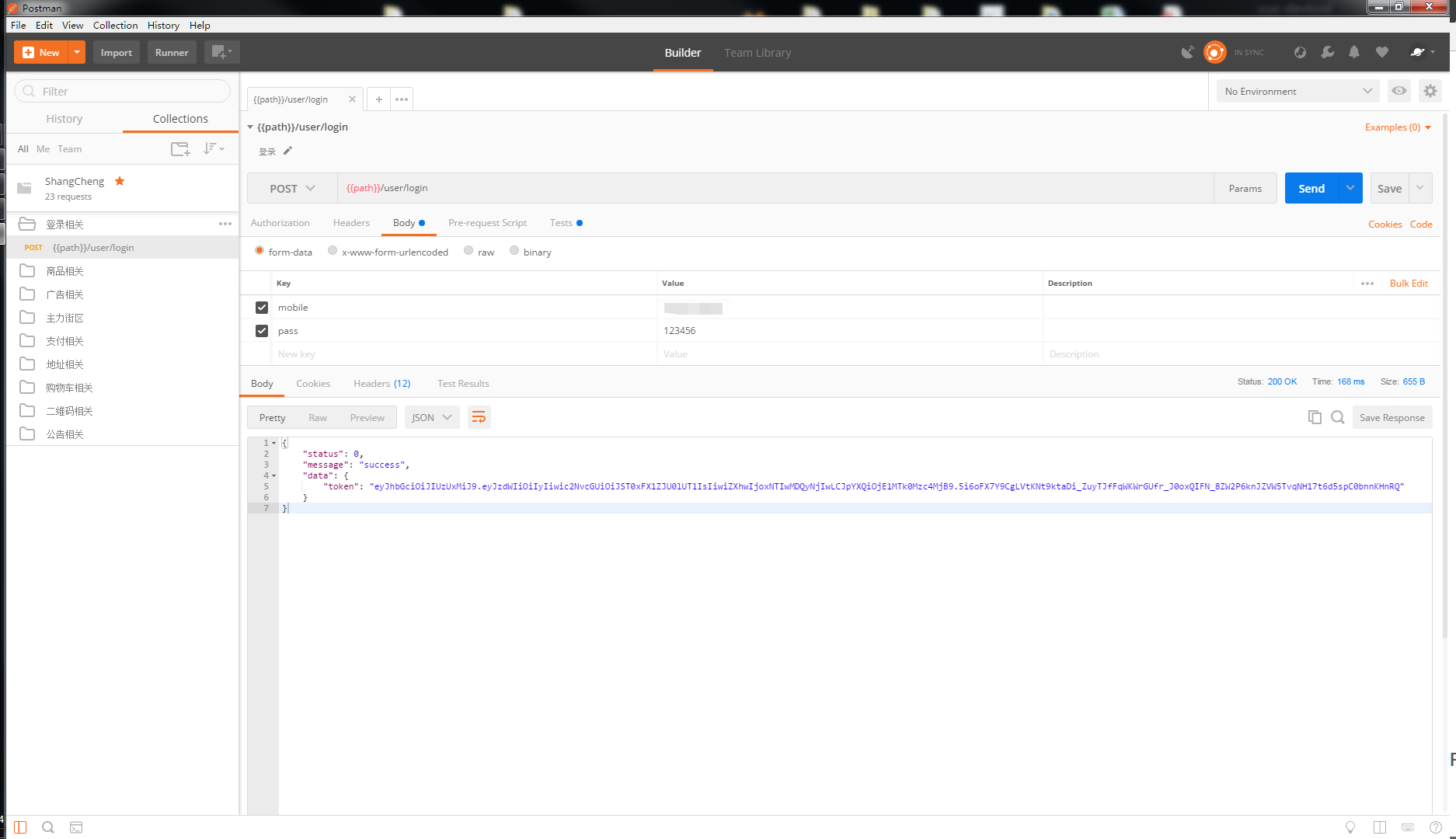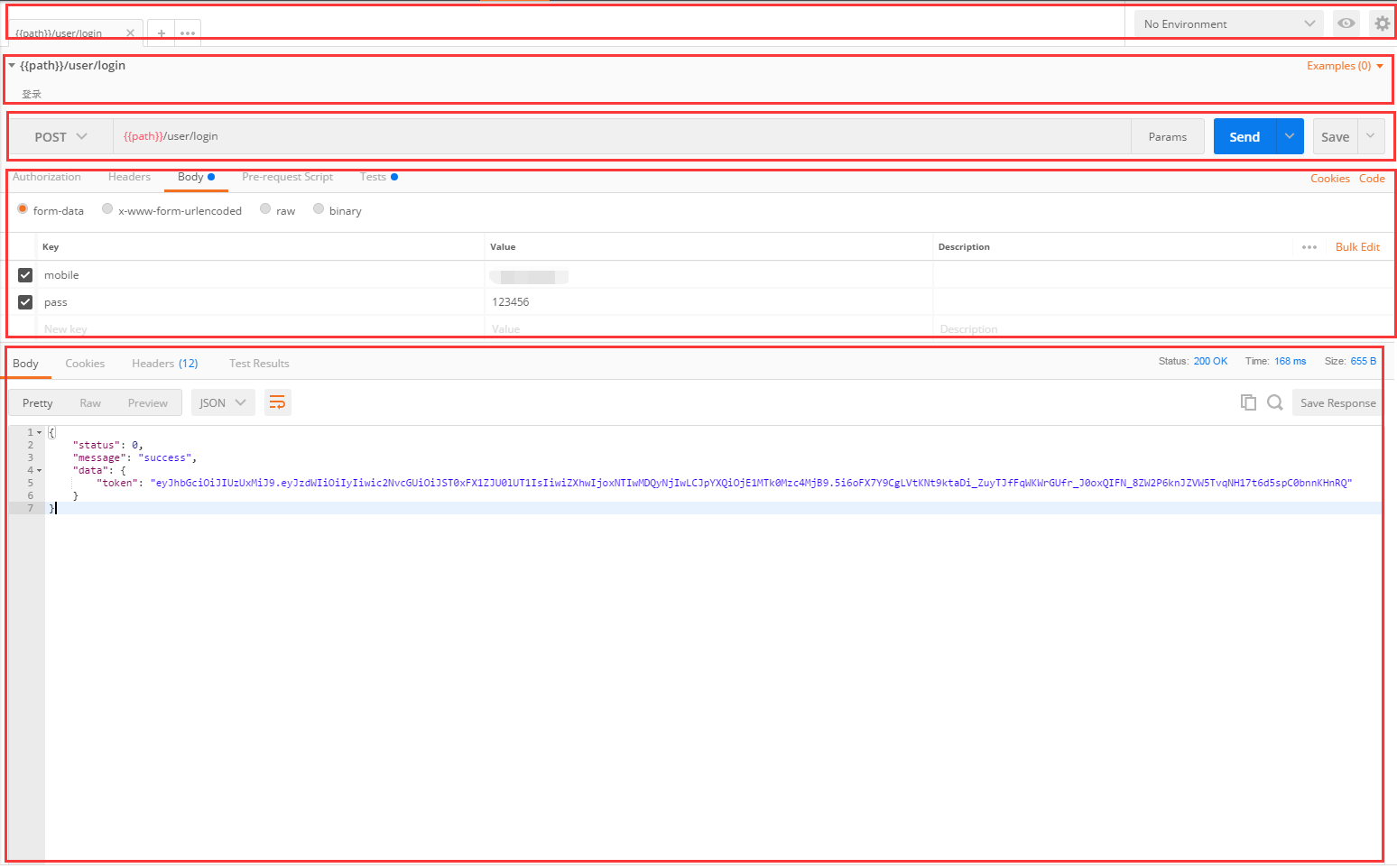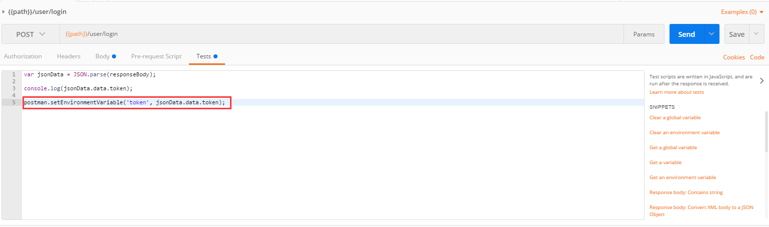 test中编写代码,将token做为一个变量保存到全局或者环境变量(需要先创建一个环境)中,在其他接口中直接使用此变量即可