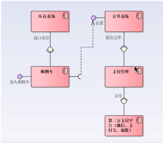 - 例如下图,购物车组件提供了加入购物车接口,同时他也使用了库存系统的商品库存接口