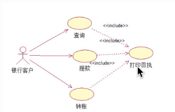 - 代表一个用例的行为包含了另外一个用例的行为,箭头指向为包含者指向被包含者